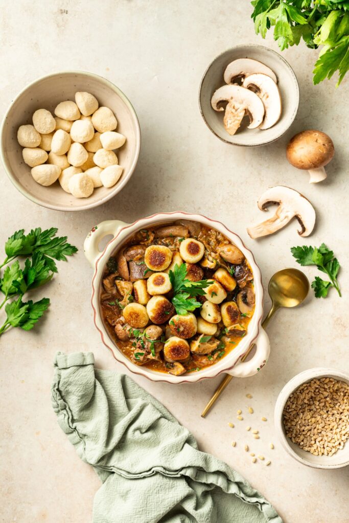 Postrežemo v plitvi glineni posodi. Na eno stran položimo bogat gobovo-mesni golaž, na drugo stran mehke njokete, po vrhu pa potrosimo popečene gobe, peteršilj in kanček kisle smetane za svežino ter lep barvni kontrast.