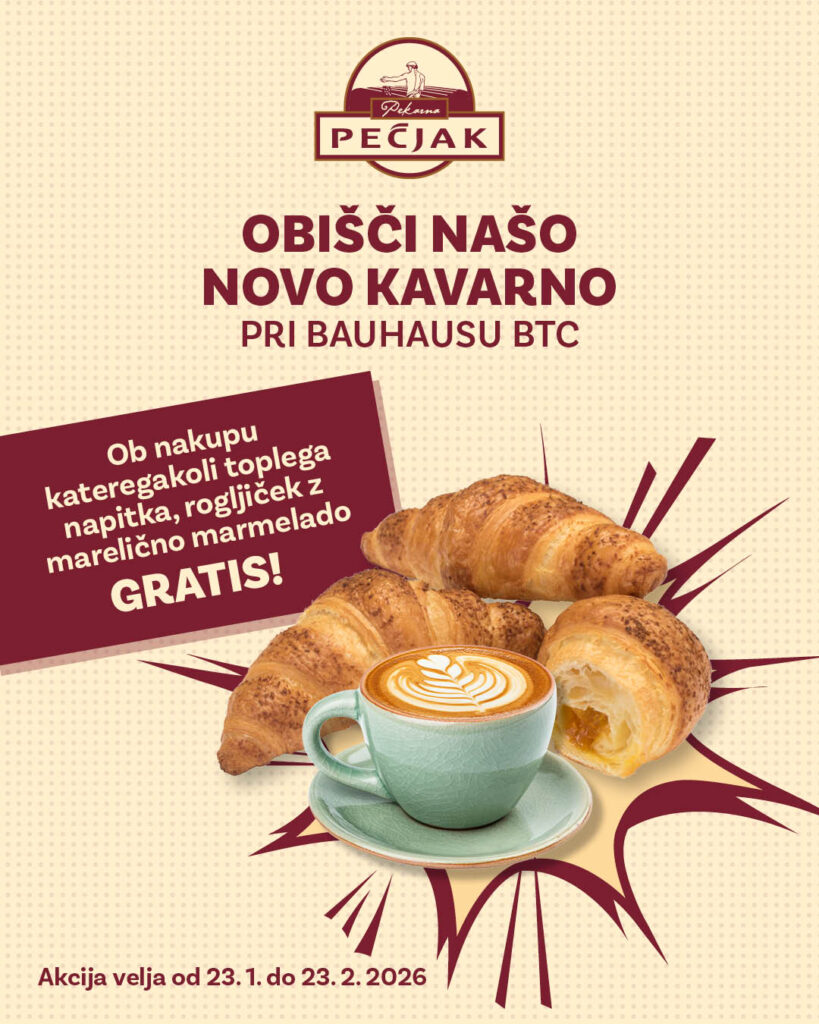1. Ob nakupu kateregakoli toplega napitka, rogljiček z marelično marmelado GRATIS!