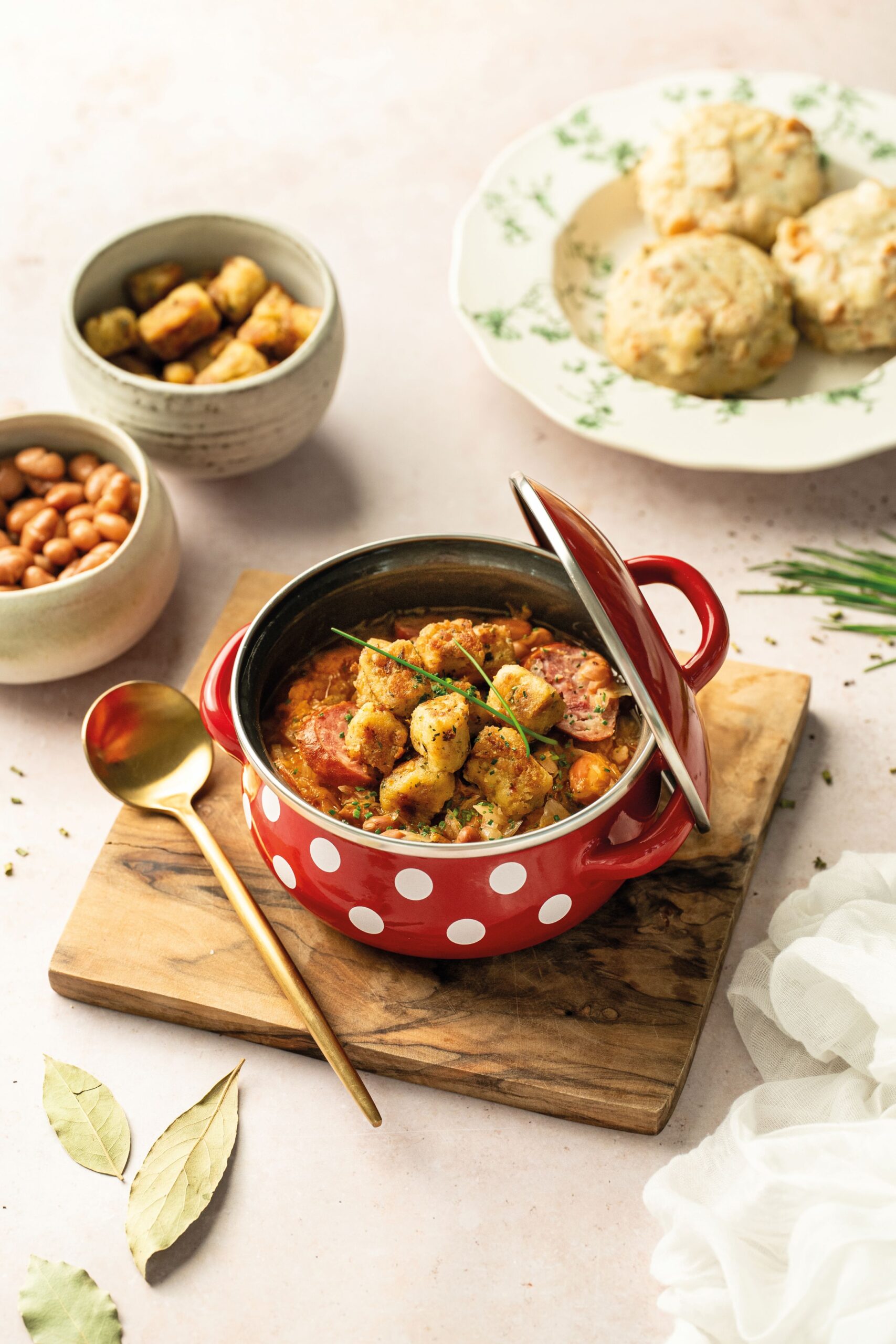 Enolončnice imamo radi. Pogrejejo nas od znotraj navzven, saj poleg krepke nasitnosti dajejo tudi občutek domačnosti. Recept za lečin curry prinaša še nekoliko drugačen okus. Leča v njej v celoti nadomesti meso s svojo hranljivostjo in obiljem beljakovin, eksotične začimbe pa ji dajo globok okus in vas izdatno ogrejejo. Zaradi dodanega kokosovega mleka je lepo svilnata in gostljata. K takšni enolončnici se neverjetno dobro priležejo domači kruhovi cmoki. Pečjakovi so narejeni iz namensko spečenega kruha, svežih jajc in začimb. Že pripravljeni v zamrzovalniku pa so tudi lahko vedno pri roki.